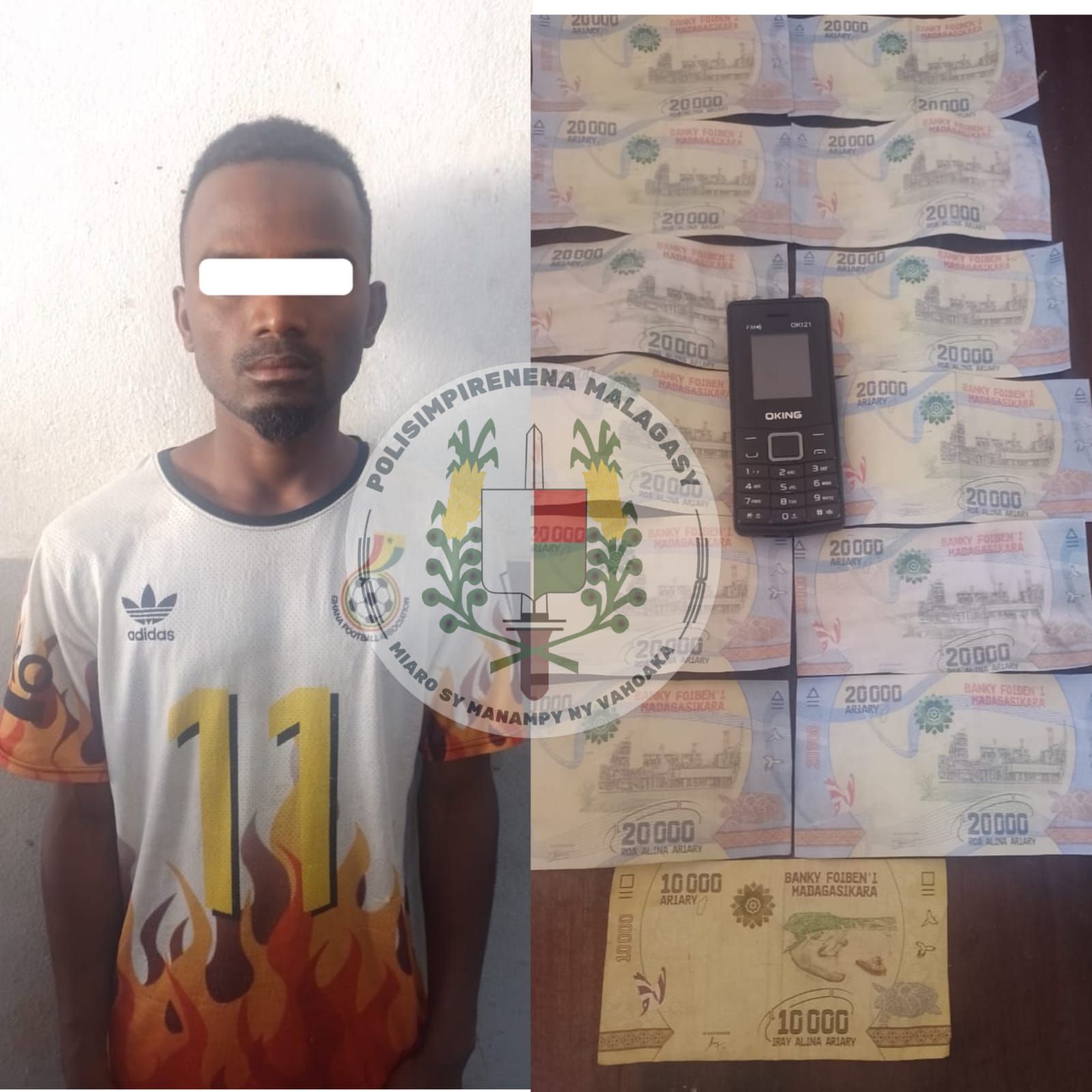 -Voasambotry ny Polisy miasa ao amin’ny Kaomisaria Boriborintany fahavalo Analamahitsy ny lehilahy iray ny 22 septambra 2025 tolakandro, rehefa nisy fitarainana nataona mpitantana cash point fa voafitak’ity lehilahy ity tamin’ny vola sandoka izy.