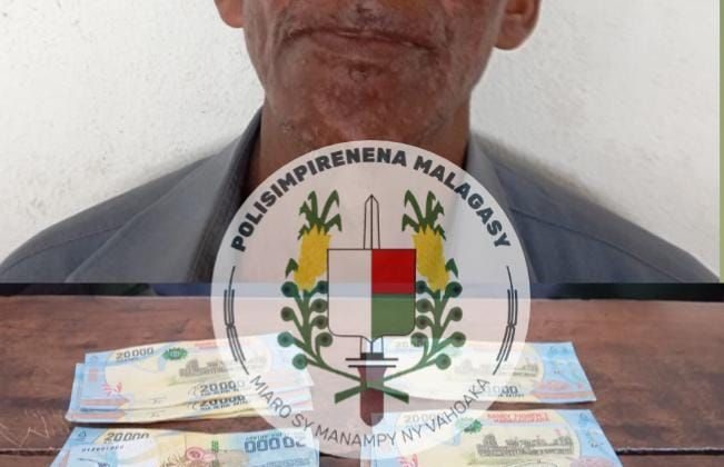 Ady amin’ny fanaovana hosoka isan-karazany – Voasambotry ny Polisimpirenena ao Ambositra ny lehilahy iray, taorian’ny nahitana vola sandoka miisa efapolo (40), mitentina roa alina ariary (20 000 Ar) isanisany teny aminy, ny tolakandron’ny alatsinainy 06 oktobra 2025, tao an-toerana. –