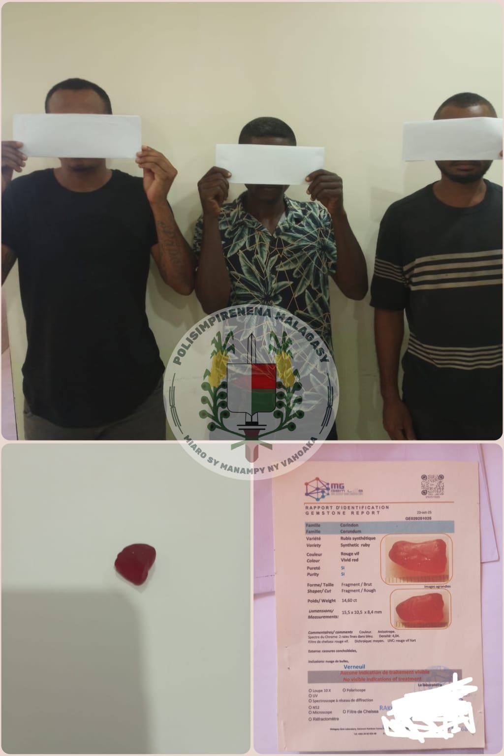– Nanokatra fanadihadiana avy hatrany ny Polisy noho izany ka nisy ny velam-pandrika natao. Voasambotra ny lehilahy roa ary mbola nahitana vato sarobidy hosoka teny amin’izy ireo. Rehefa nohadiadihana ireo roalahy dia nanondro ny olona mpanamboatra ireo vato sarobidy hosoka ireo. Voasambotra ihany koa ity farany rehefa hita ny toerana nisy azy.