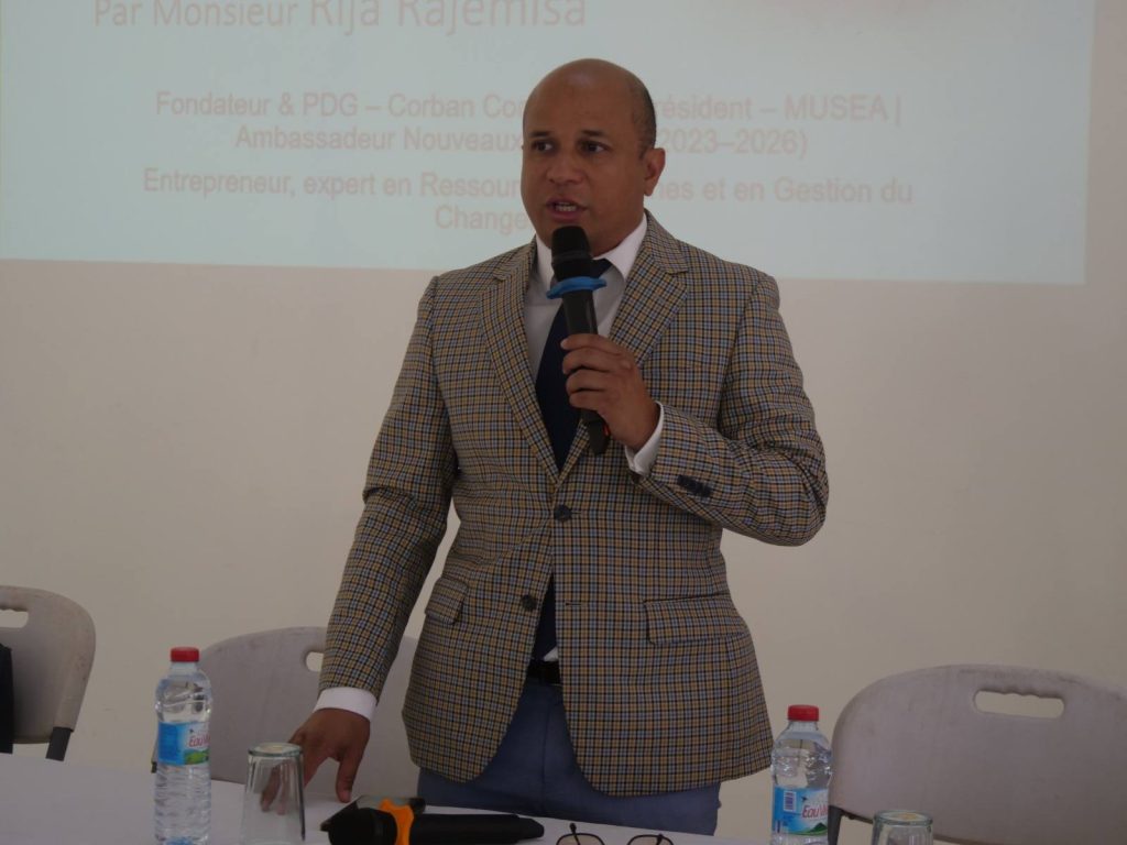 – Nifantoka tanteraka tamin’ny fahaiza-mitarika ho amin’ny fanovàna ny fampiofanana, ka Andriamatoa Rija RAJEMISA no nizara ny traikefany ; manampahaizana manokana amin’ny hay tarika sy fanovàna, sady Filoha Tale Jeneralin’ny Corban Consulting, Filohan’ny MUSEA, ary Ambassadeur an’ny « Nouveaux Horizons » eto Madagasikara 🇲🇬.