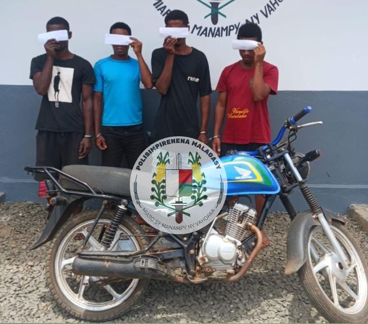 – Voasambotry ny Polisimpirenena avy ao amin’ny Kaomisaria Antalaha ireto jiolahy miisa efatra ireto, fantatra fa malaza ratsy amin’ny resaka halatra moto ao atampontanànan’ny Antalaha.