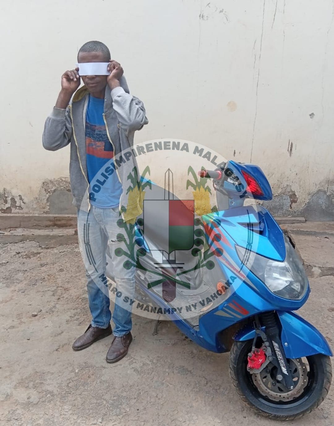 🔍 Nanokatra fanadihadiana ny Polisimpirenena. Vokatry ny ezaka natao, hita tao anaty garazy iray tao Ambatolampy ilay moto, ary nosamborina tany Antanimena ity lehilahy tompon’antoka tamin’ny halatra ity. Nentina eo anivon’ny Kaomisaria ao Ambohimanarina ilay lehilahy sy ny moto hita mba hanohizana ny fanadihadiana.