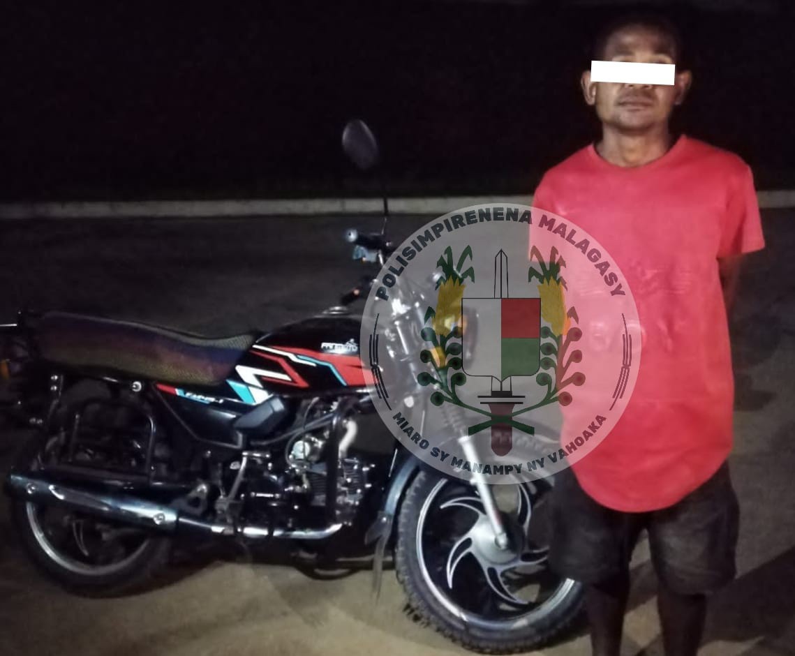 – Nisy moto an’olona avy any Ambatondrazaka no naharaisana fitaraina fa very. Taorian’ny fikarohana dia fantatra fa ao Andreba Gara ilay izy, nidina ifotony avy hatrany ny Polisy io andro io ihany ka tra -tehaka ilay lehilahy niaraka tamin’ilay kodiaran-droa halatra izay tsara petrapetraka tao aminy.