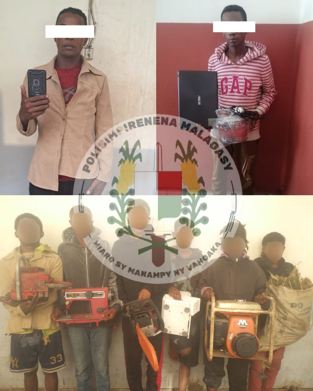 – Ny 10 aprily 2026, rava ny tambajotran- jiolahy iray nisy mpikambana enina efa nampikaikaika ny mponina tamin’ny resaka vaky trano teny amin’ny fokontany Ankofafa, Sahalava sy ny manodidina . Nandritra ny fisamborana azy ireo dia tratra ireo entana halatra isan-karazany toy ny milina fanjairana sy fitaovana samihafa.