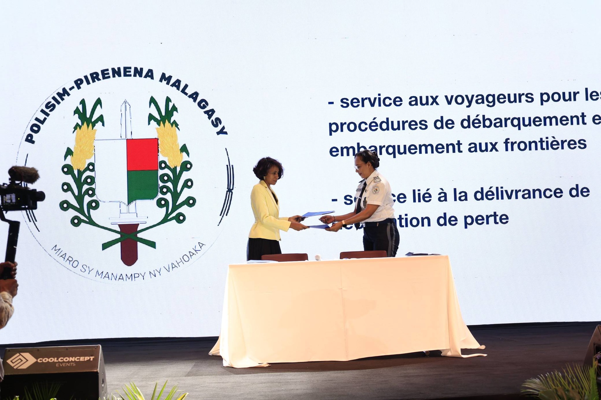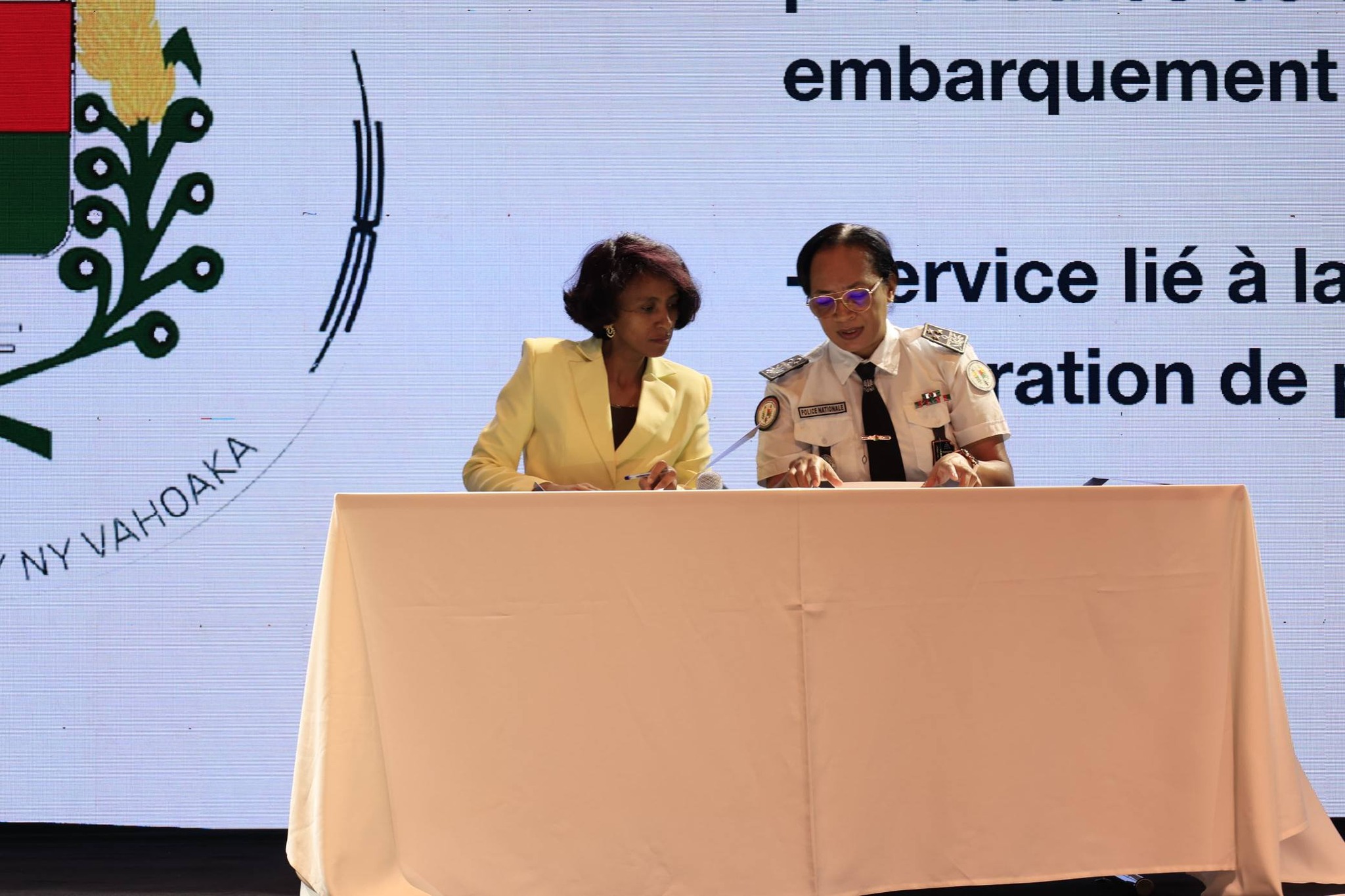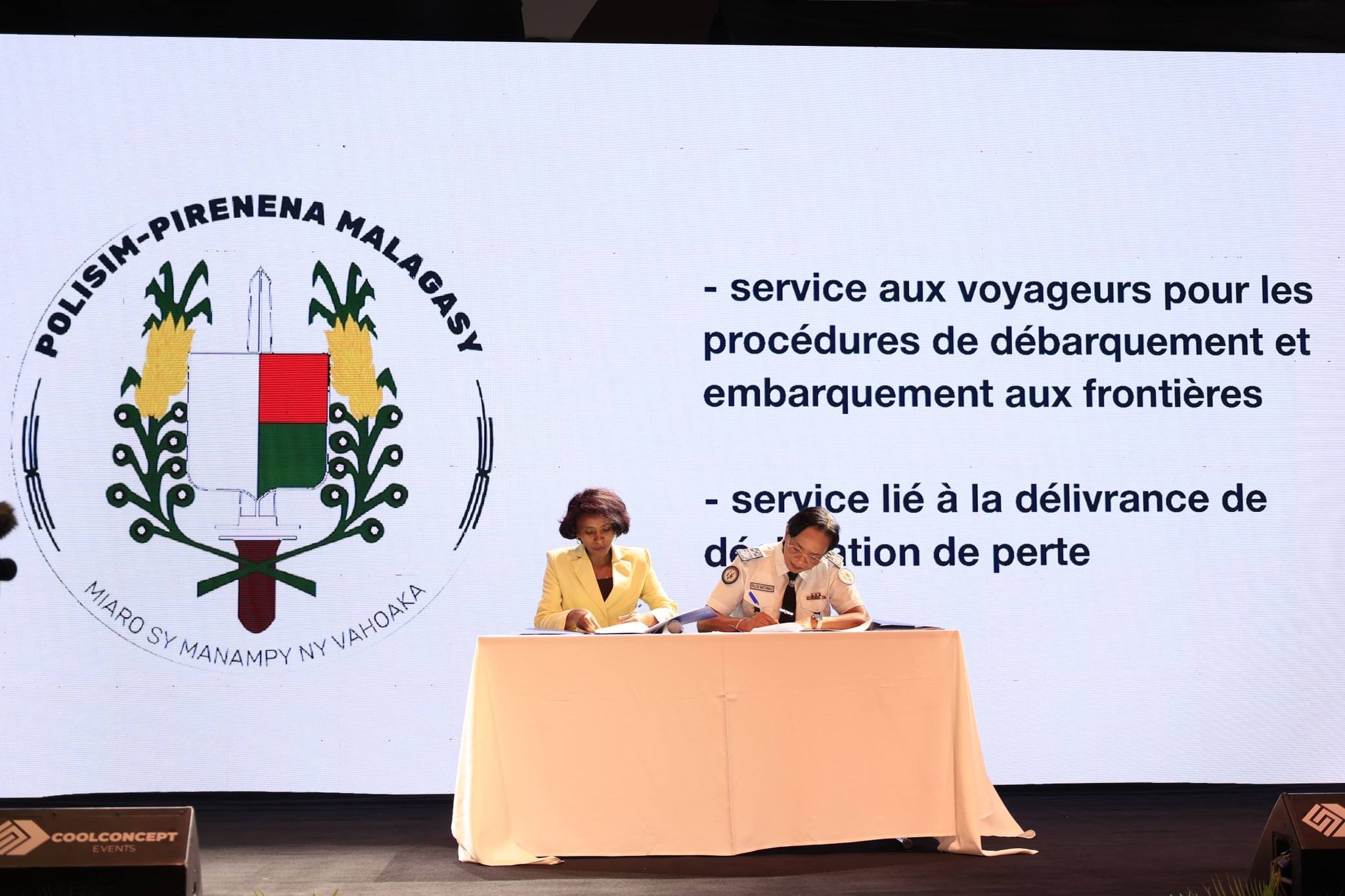 – Nisolo tena ny Minisiteran’ny Filaminambahoaka ary nanao sonia ny fifanarahana, ny Sekretera Jeneralin’ny Minisiteran’ny Filaminambahoaka, ny Contrôleur Général de Police RANJAVOLOLONA Julie Claudette, sy ny Talen’ny « Systèmes d’Information et des Transmissions », ny Commissaire de Police RANDRIAMANOHISOA Tovohery Hajanirina.