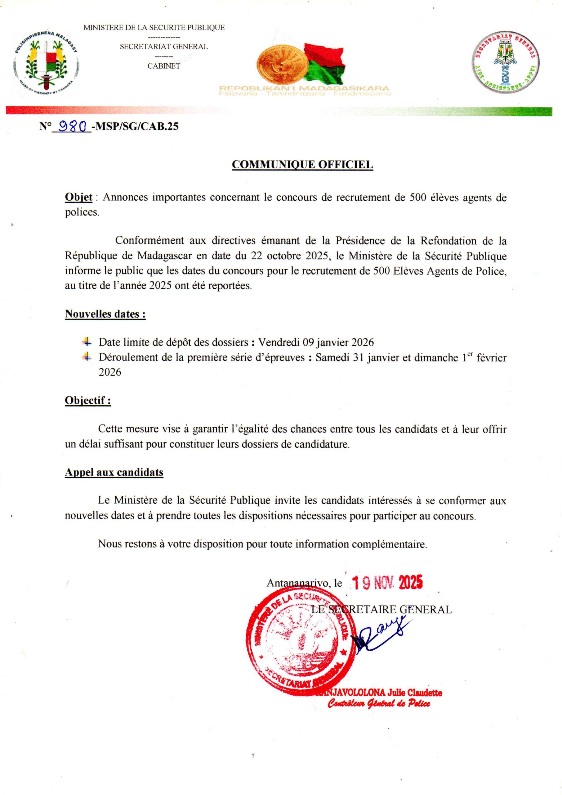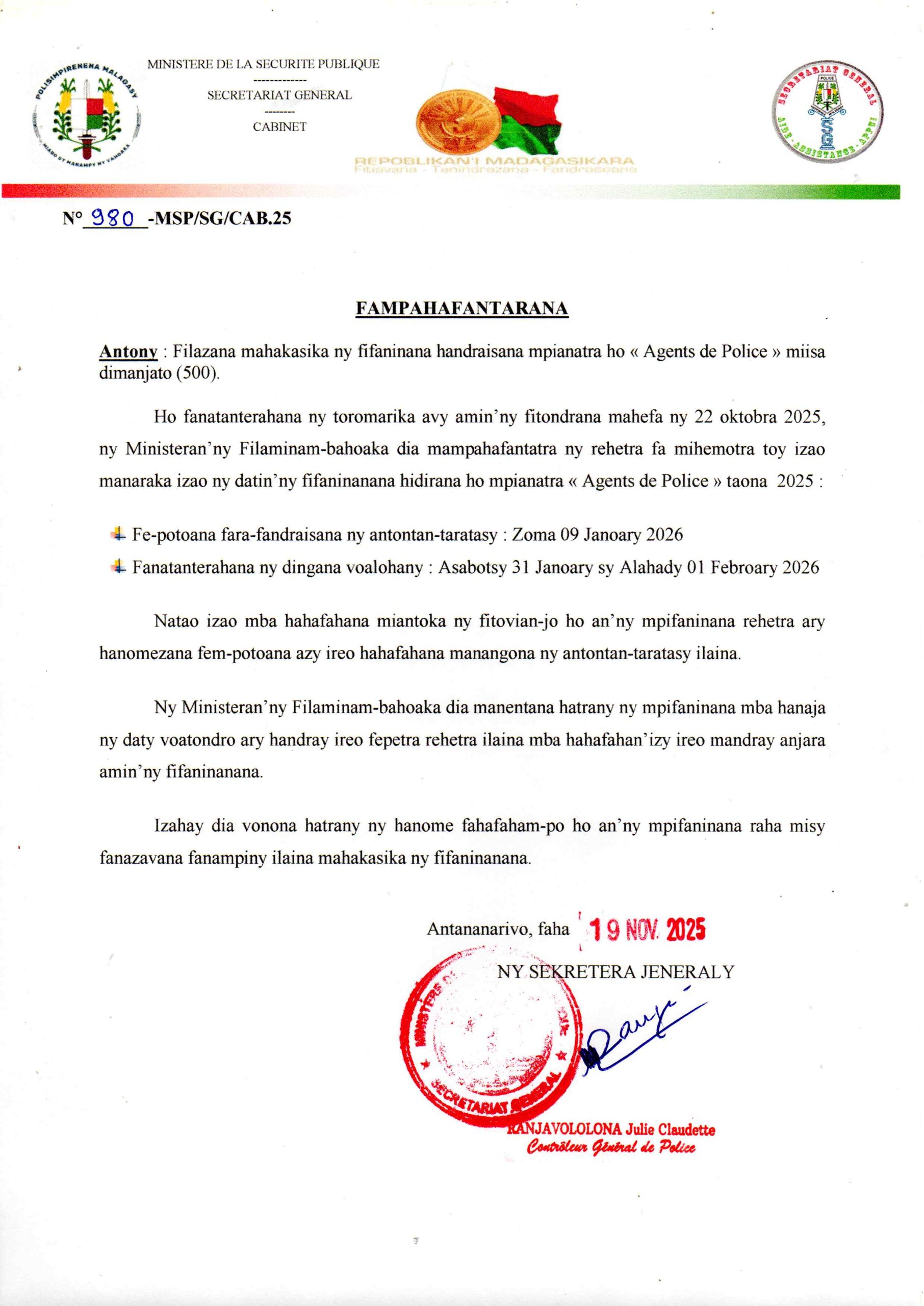 Filazana mahakasika ny fifaninanana handraisana mpianatra ho « Agents de Police » miisa dimanjato (500)